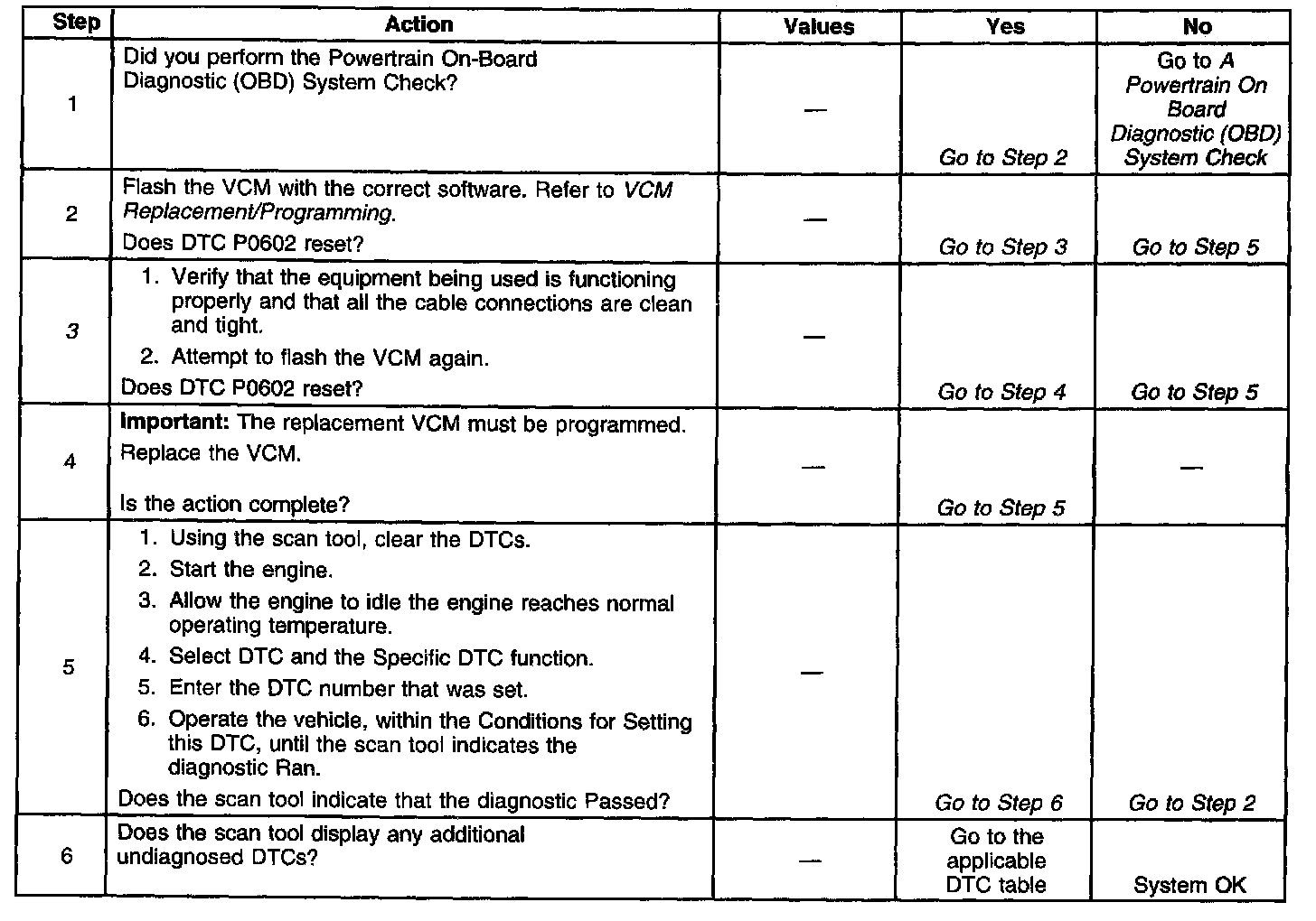 If a control module is installed without being programmed, DTC P0602 will be set. During reprogramming and immediately after completion, DTC P0602 will also be set. This DTC should be successfully cleared after following the reprogramming procedures.