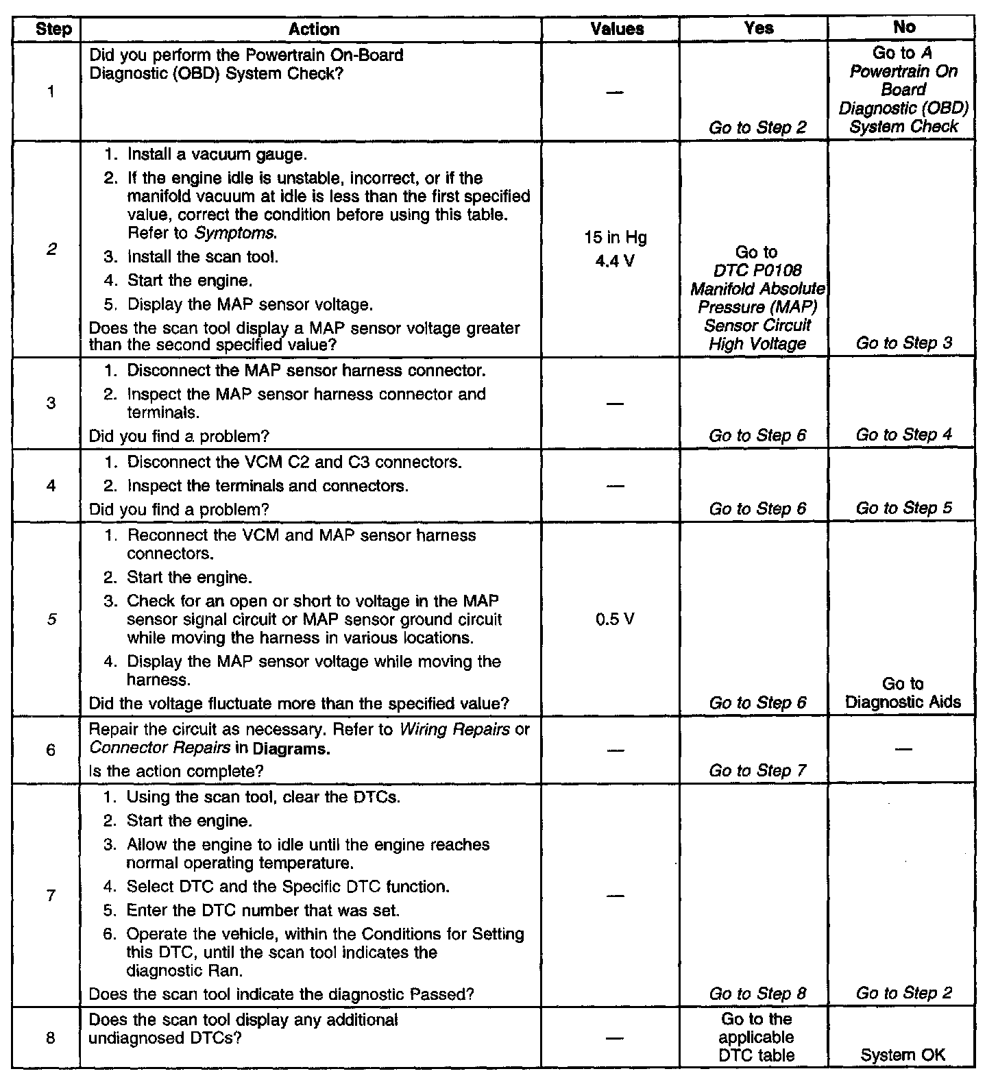 2. If the MAP sensor signal is more than 4.6 volts then the condition is present. Even though DTC P0108 is not set, the P0108 table is more comprehensive and may aid in diagnosis.
