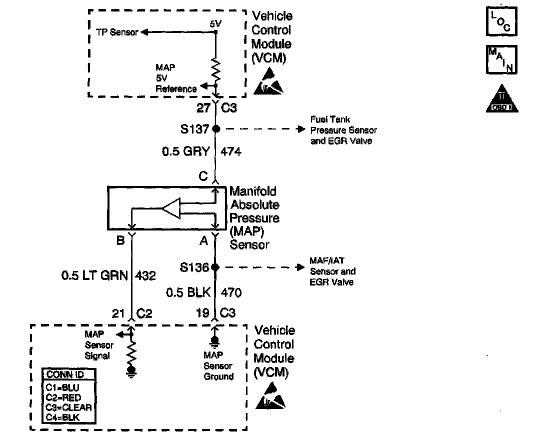 The Manifold Absolute Pressure (MAP) sensor is a pressure sensor. The control module supplies the MAP sensor a reference voltage, signal, and ground circuits. When manifold vacuum is low, the MAP sensor signal voltage rises to a value near the reference voltage, and the MAP sensor signal voltage decreases when the manifold vacuum increases. The control module monitors the MAP sensor signal circuit voltage in order to calculate the vacuum within the intake manifold.