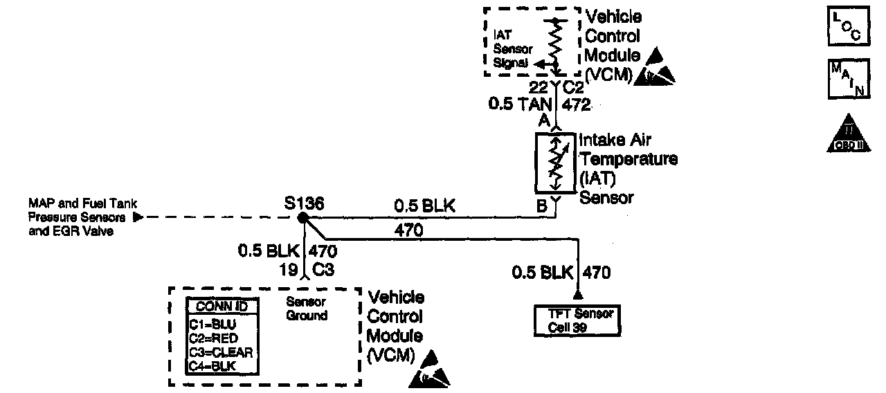 The Intake Air Temperature (IAT) sensor is a thermistor. The control module supplies the IAT sensor a reference voltage on the IAT sensor signal circuit and a ground circuit. When the IAT sensor resistance is high, indicating a cold sensor, the IAT sensor signal voltage remains near the supplied voltage and decreases the signal voltage as the sensor warms. The control module monitors the IAT sensor signal circuit in order to calculate the temperature of the air entering the engine.