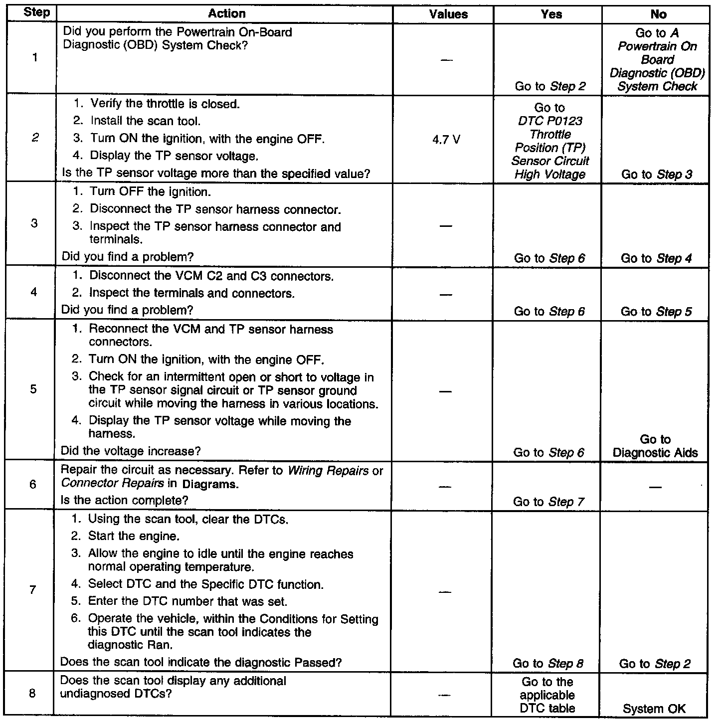 2. If the TP sensor voltage is more than 4.7 volts, then the condition is present. Even though DTC P0123 did not set, this DTC is more comprehensive and may aid in diagnosis.