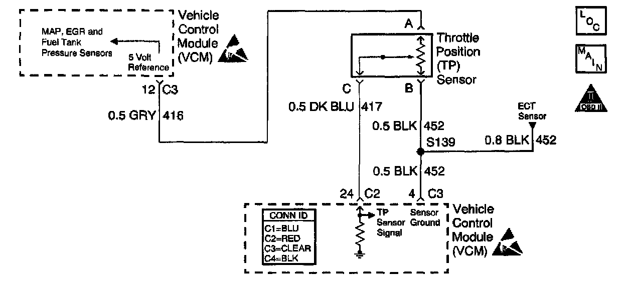 The Throttle Position (TP) sensor is a potentiometer. The control module supplies the TP sensor a reference voltage, a signal, and ground circuits. When the throttle is depressed, the TP sensor signal rises to near the reference voltage. When the throttle is released, the TP sensor signal decreases from the reference voltage. The control module monitors the TP sensor signal circuit voltage in order to determine the throttle blade angle, or opening.