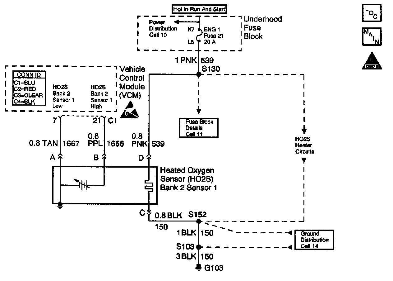 13. If the voltage observed in step 8 is less than the range specified, it indicates a short between the HIGH and LOW circuits, or a short between the HIGH circuit and ground. If you disconnect the HO2S and the Vehicle Control Monitor (VCM), the resistance between the HIGH and LOW circuits, and the resistance between the HIGH circuit and ground should measure infinite.
