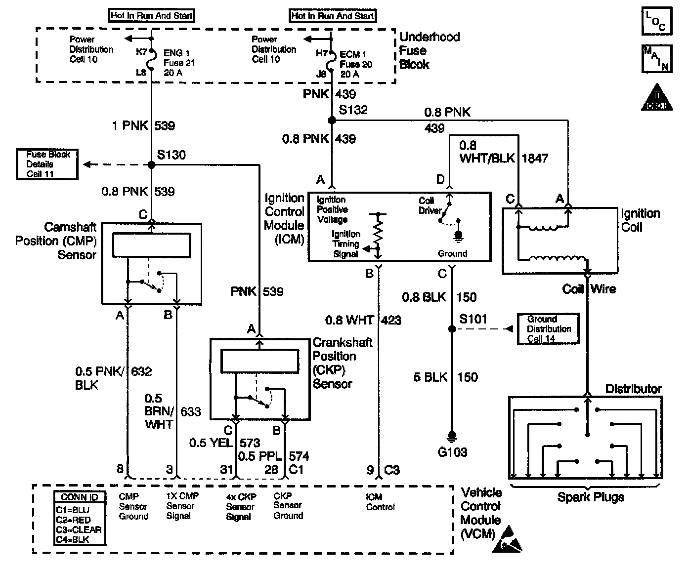 The enhanced ignition system uses the crankshaft position (CKP) sensor in order to provide a timing input to the control module. Ignition control (IC) spark timing for each cylinder is based on this input. The control module provides the ignition timing signal to the Ignition Control Module (ICM) to control the ignition coil. Each timing pulse detected by the ICM allows it to energize the ignition coil. A large secondary ignition voltage is induced in the secondary coil by the primary coil. This high voltage is switched to the correct spark plug by the distributor.