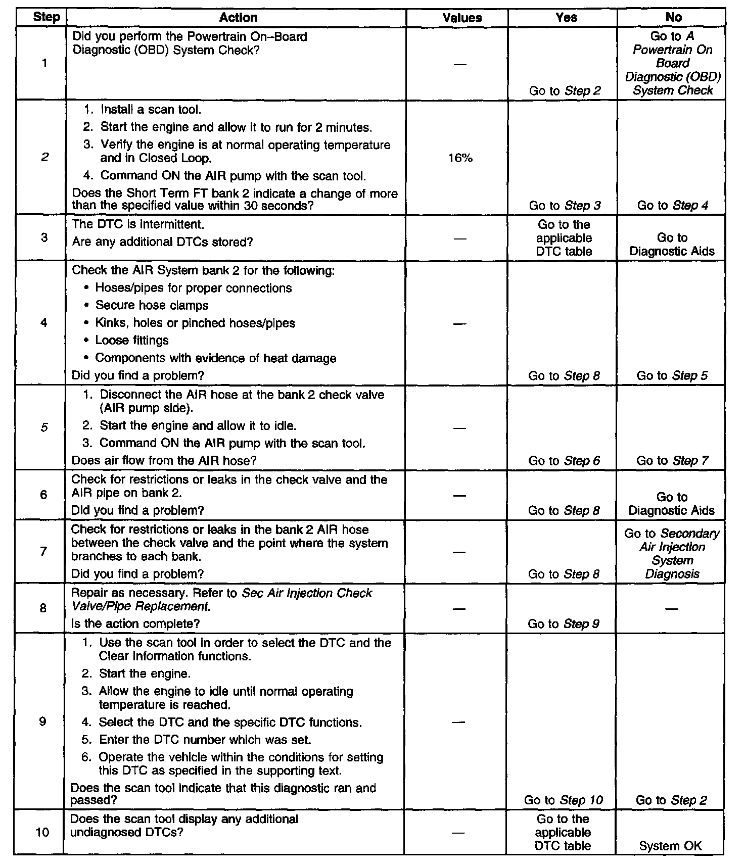 The VCM checks that the HO2S voltages return to above a rich threshold when the AIR pump is disabled. If the VCM determines that the HO2S voltages for both banks did not respond as expected during the tests, DTC P0410 will set. If only one sensor responded, the VCM will set either a DTC P1415 or P1416 to indicate on which bank the AIR system is inoperative.