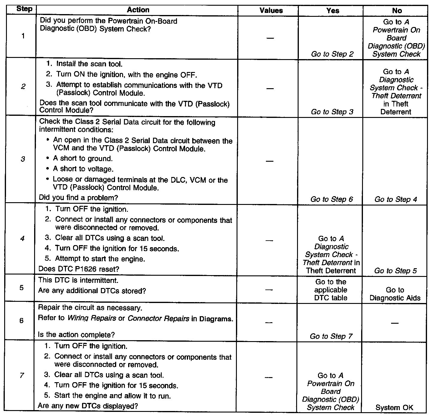^ If the Class 2 serial data circuit is shorted to ground or shorted to voltage, then all systems connected to the serial data circuit will not be able to communicate properly. Systems capable of storing loss of communications DTCs (DTCs with the letter U as a prefix) will have these codes stored in their memory. If a DTC U1192 is stored in the VCM memory along with the P1626, then a fault occurred at some point after the VCM received the correct password. The VTD must also be checked for intermittent operation due to a loss of power or ground to the module itself. After repairing the cause of DTC P1626, clear all DTCs from the systems capable of storing this DTC and DTC U1192.
