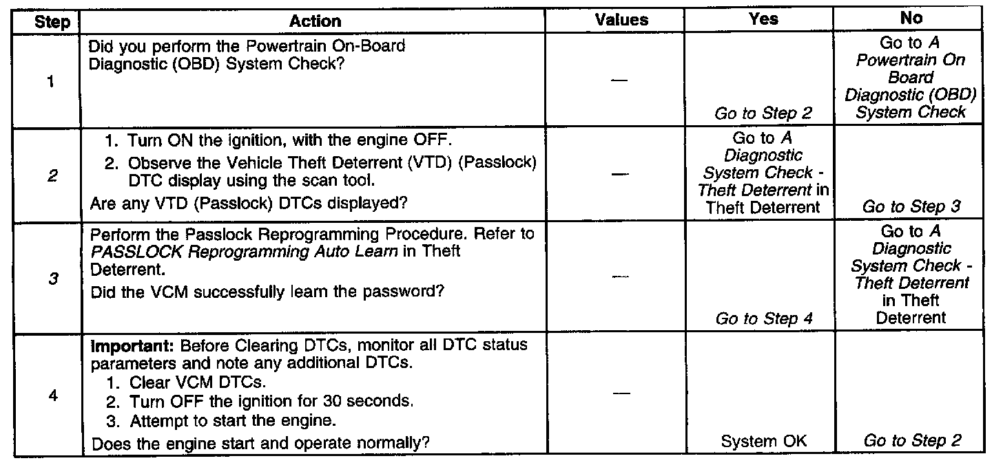 When the passlock portion of the VTD system has sensed the proper operation of the ignition switch and lock, or determined that the switch and lock have not been tampered with, the VTD (Passlock) module transmits a password to the control module. Fuel delivery is enabled if this password matches the password stored in the control modules memory. If a component in the theft deterrent system has been replaced, the modules need to relearn the password of the new components. If the relearn procedure was not performed, this Diagnostic Trouble Code (DTC) will set.