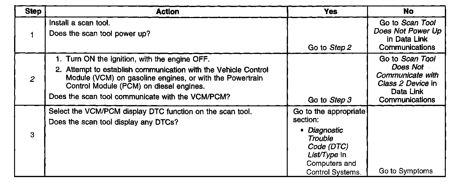 2. Lack of communication may be due to a partial malfunction of the class 2 serial data circuit or due to a total malfunction of the class 2 serial data circuit. The specified procedure will determine the particular condition.