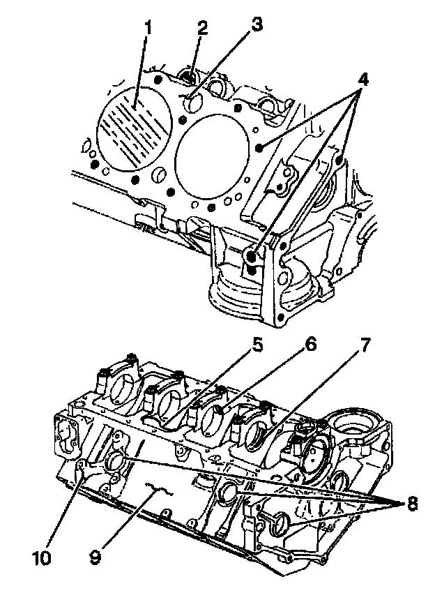 - Crankshaft bearing caps (6) and the crankshaft bearing bores (7) for damage