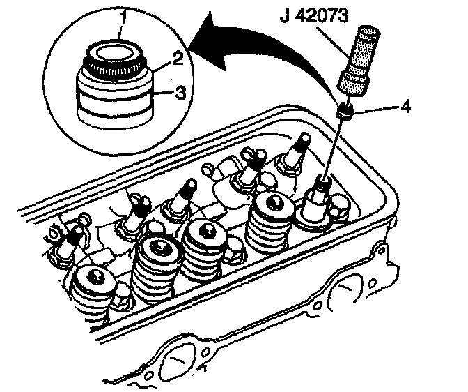 5. Install the valve stem oil seal onto the valve guide until the J 42073 bottoms against the valve spring seat.
