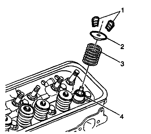 8. Install the valve spring cap (2) onto the valve spring (3) and over the valve stem.