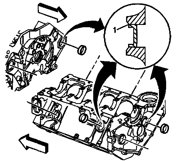 A properly installed engine block core hole plug must be installed flush with the bottom of the chamfer (1) of the engine block core hole.