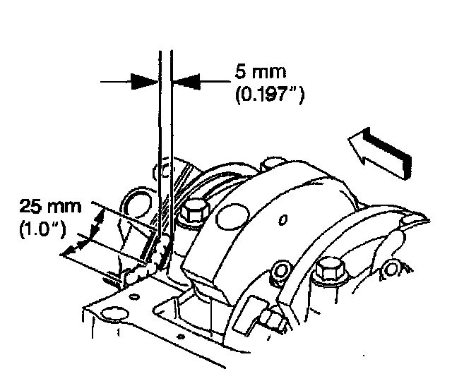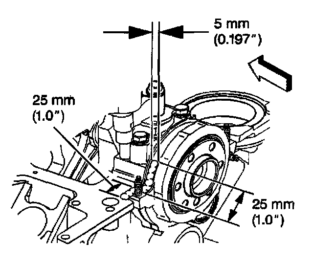 3. Apply a 5 mm (0.197 inch) wide and 25 mm (1.0 inch) long bead of adhesive GM P/N 12346141 or equivalent, to the crankshaft rear oil seal housing to engine block junction at the oil pan sealing surfaces.