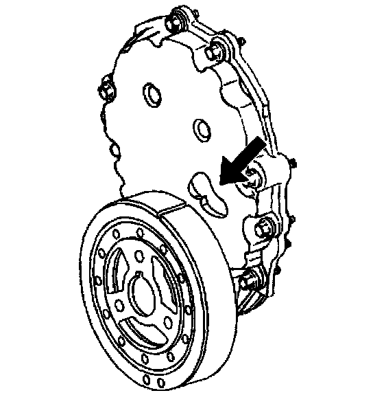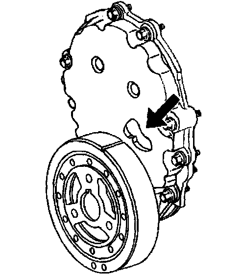 2. Turn the crankshaft clockwise until the alignment mark on the crankshaft balancer is aligned with the notch in the engine front cover tab.