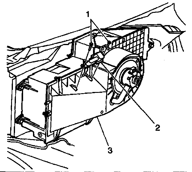 1. Remove the electrical connectors from the resistor (2) and the blower motor.