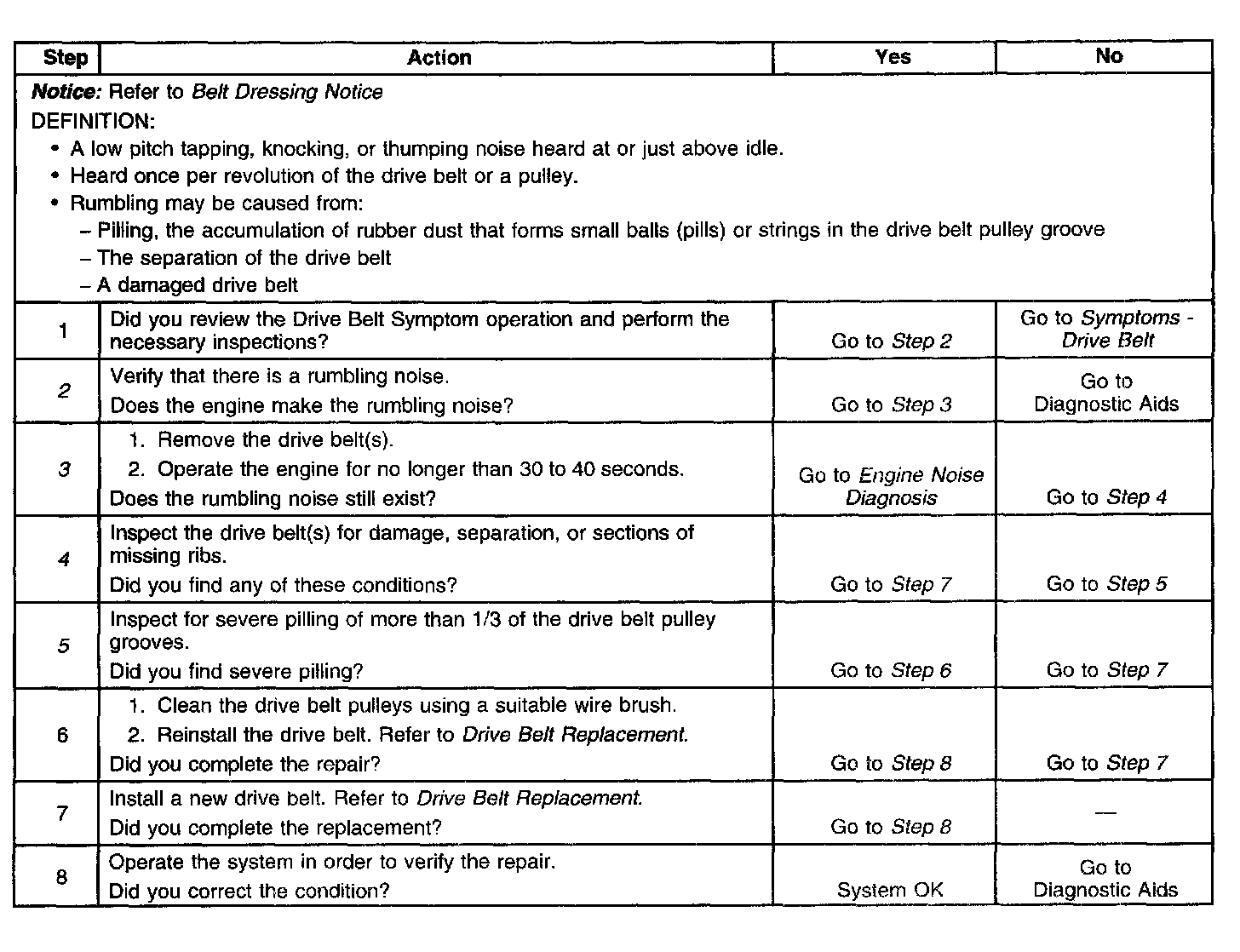 3. This test is to verify that the drive belt(s) is causing the rumbling noise. Rumbling noise may be confused with an internal engine noise due to the similarity in the description. Remove only one drive belt at a time if the vehicle has multiple drive belts. When removing the drive bel the water pump may not be operating and the engine may overheat. Also DTCs may set when the engine is operating with the drive belt removed.