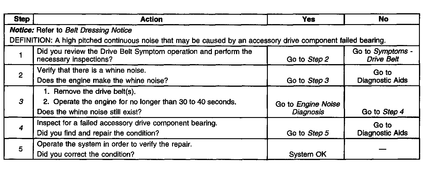 4. The inspection should include checking the drive belt tensioner and the drive belt idler pulley bearings. The drive belt(s) may have to be installed and the accessory drive components operated separately by varying their loads. Refer to the suspected accessory drive component for the proper inspection and replacement procedure.