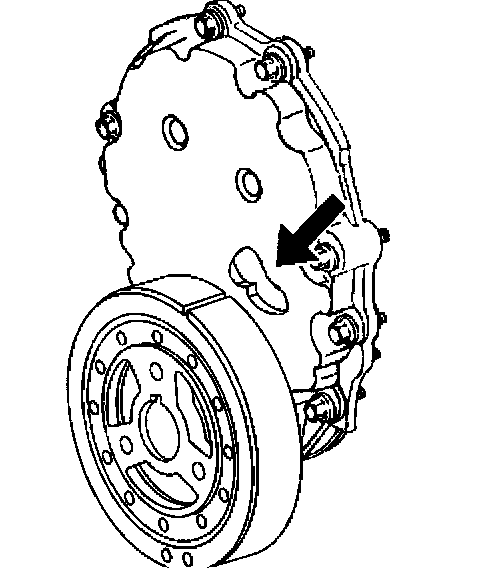 5. Turn the crankshaft clockwise 1 revolution until the alignment mark on the crankshaft balancer is aligned with the notch in the engine front cover tab.