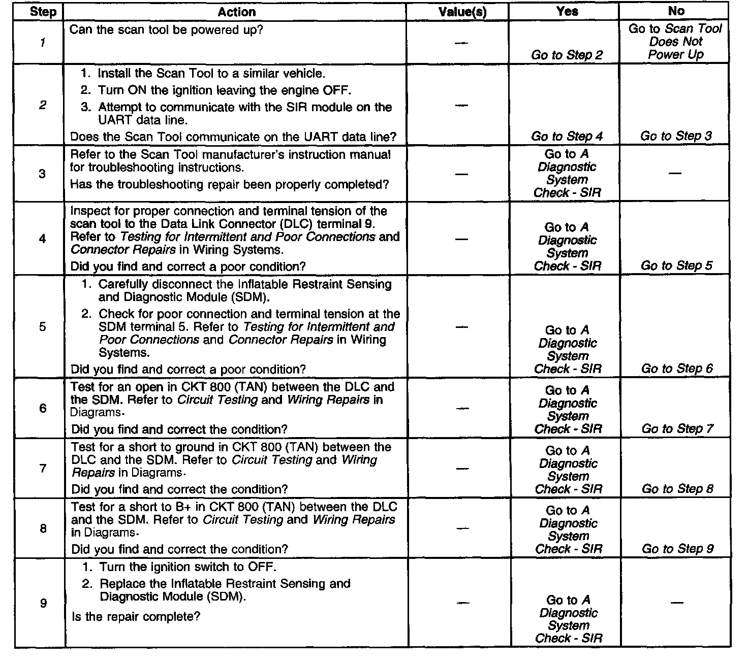 A loss of UART communications would prevent the Scan Tool from communicating with the SDM during SIR system diagnosis.