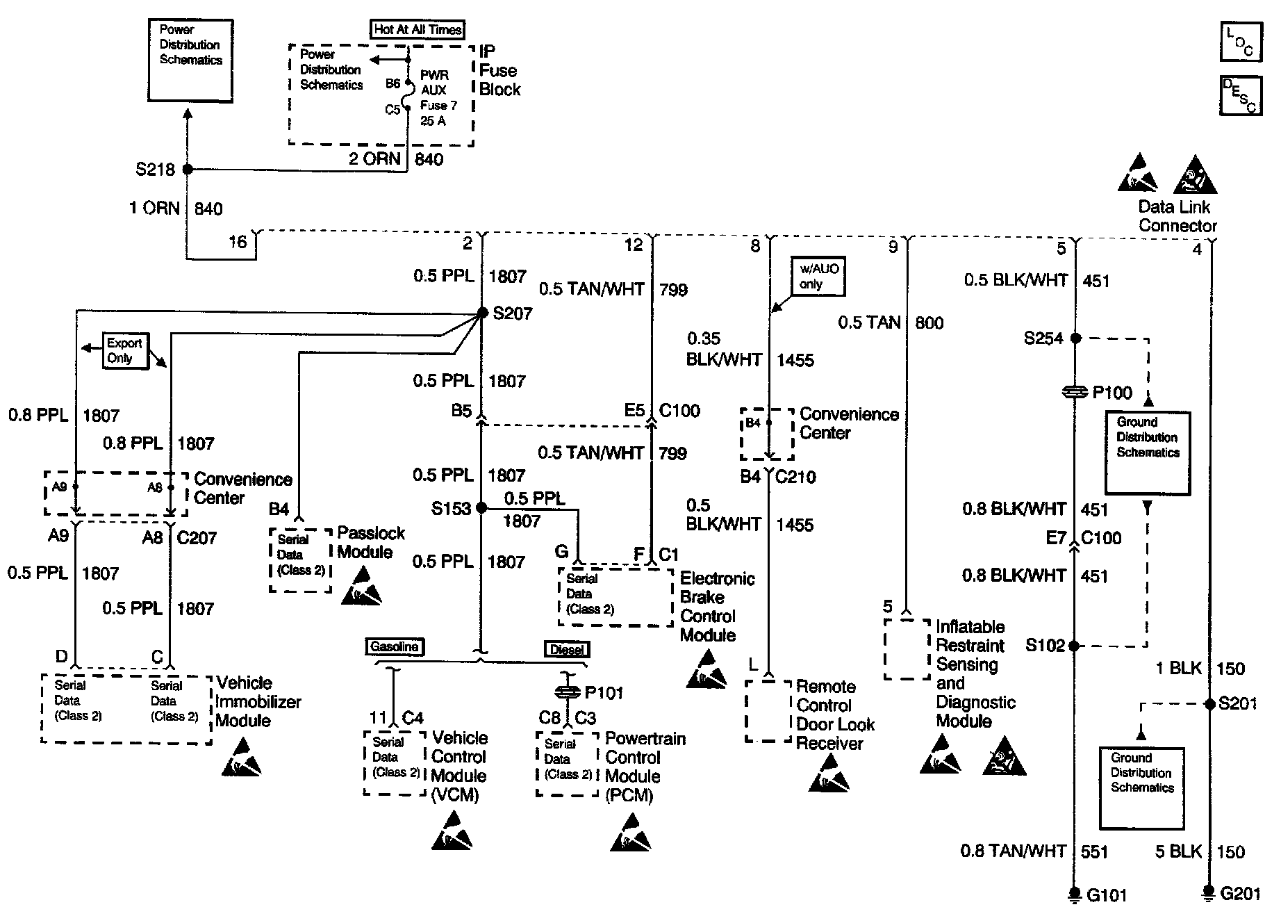 Data Link Connector (DLC) Schematics: Fuse Block, Theft Deterrent, VCM/PCM, Remote Control Door Lock Receiver, SDM, G101, And G201: