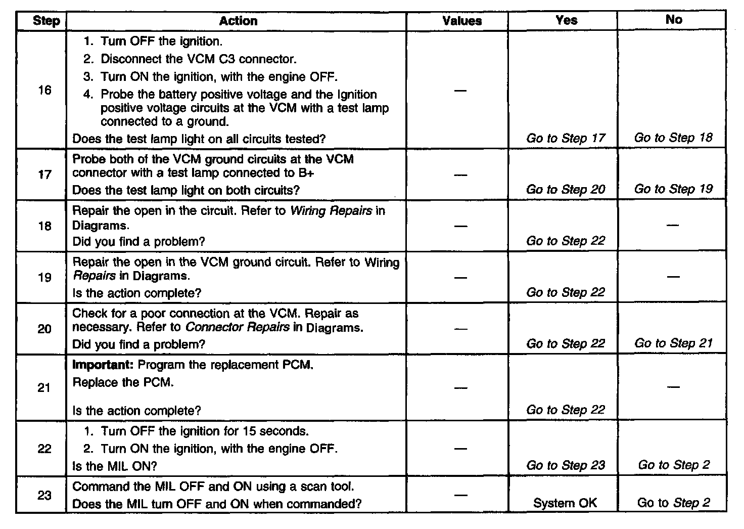 6. This step checks the MIL control circuit for a short to B+ or a problem with the VCM.