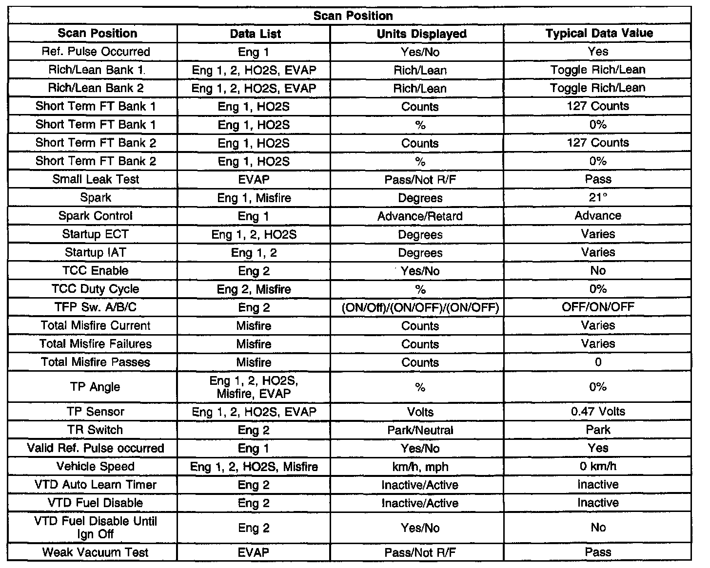 Use the scan tool data listed in this table for comparison after the Powertrain On-Board Diagnostic System Check and finding the on-board diagnostics function properly with no diagnostic codes displayed. The Typical Scan Tool Data values are an average of display values recorded from normally operating vehicles. The Typical Scan Tool Data values are intended to represent what a normally functioning system would display. The values you get may vary due to a low battery charge or other reasons. But they should be close.