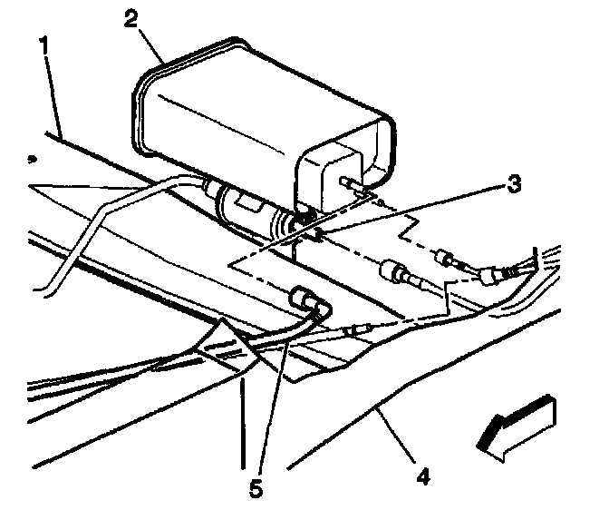 1. Disconnect the [1][2]EVAP hoses (5) from the canister (2). Mark the hoses for installation on the new canister.