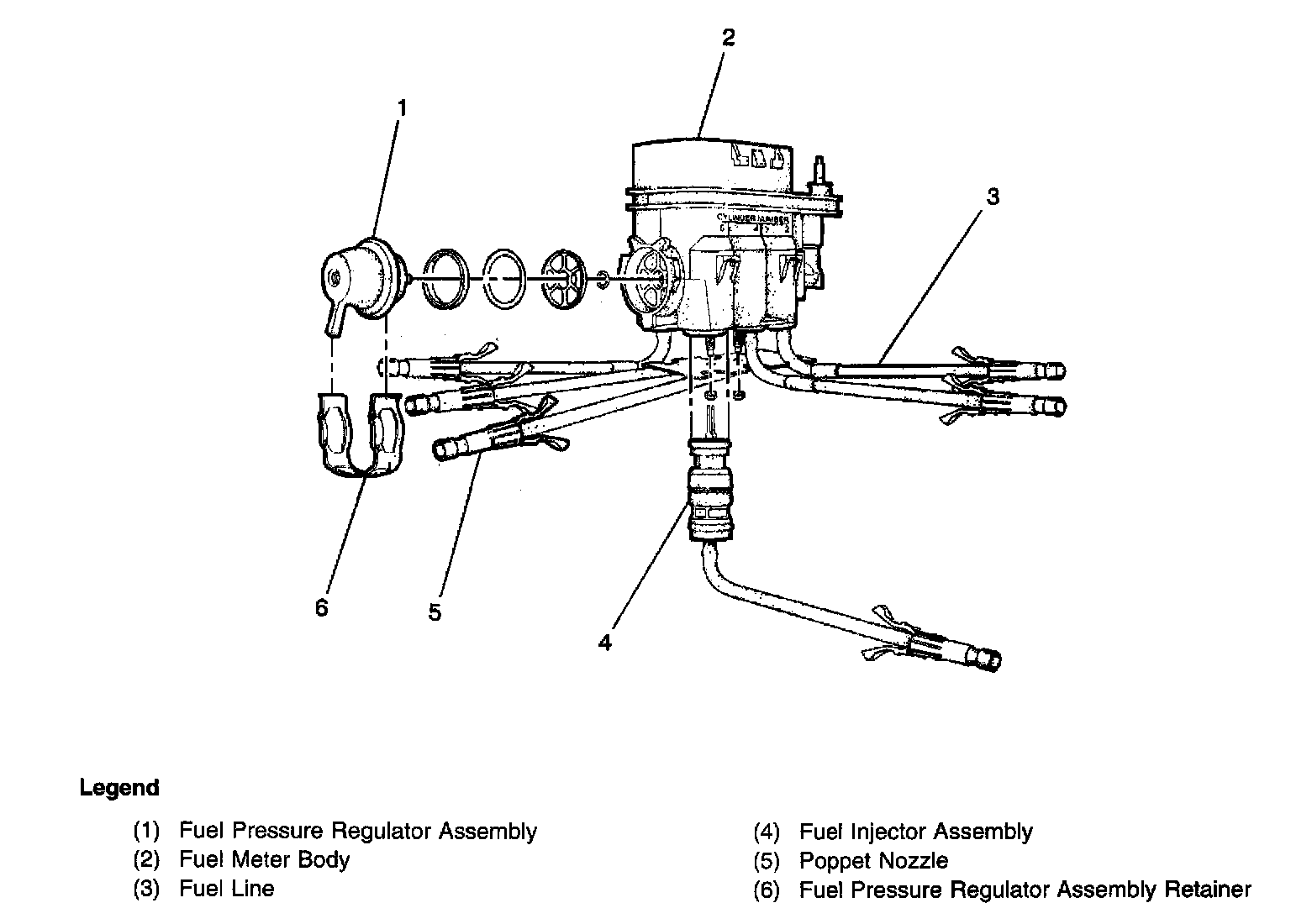 The fuel meter body assembly is mounted to the lower portion of the intake manifold. The assembly performs the following functions: