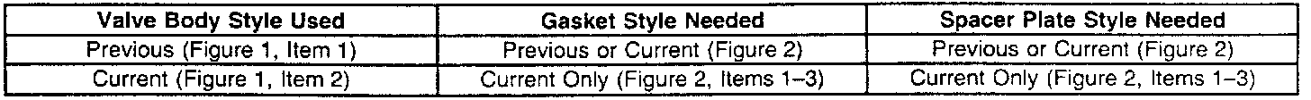 Due to the valve body change, the gaskets and spacer plate also change and must be used together as a set. Do not mix any of these components. Failure to use the parts as a set will cause improper function.