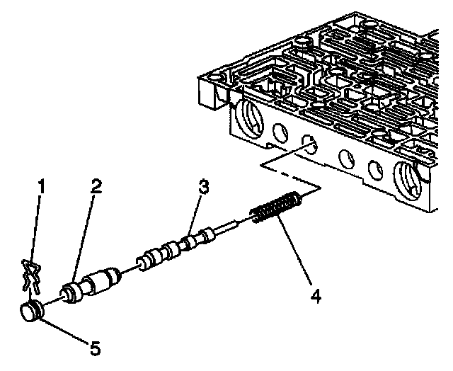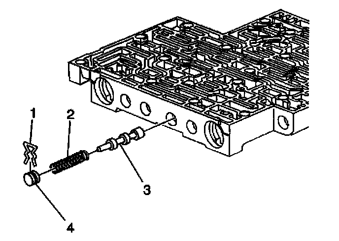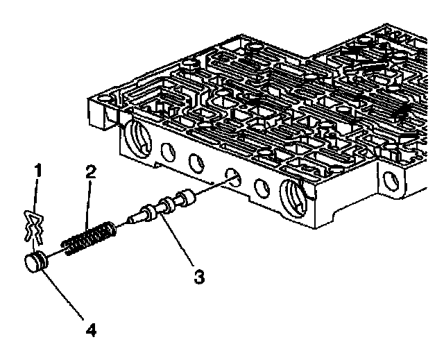 22. Remove the 3-4 relay valve (2) and the 4-3 sequence valve (3) and the 4-3 sequence valve spring (4).