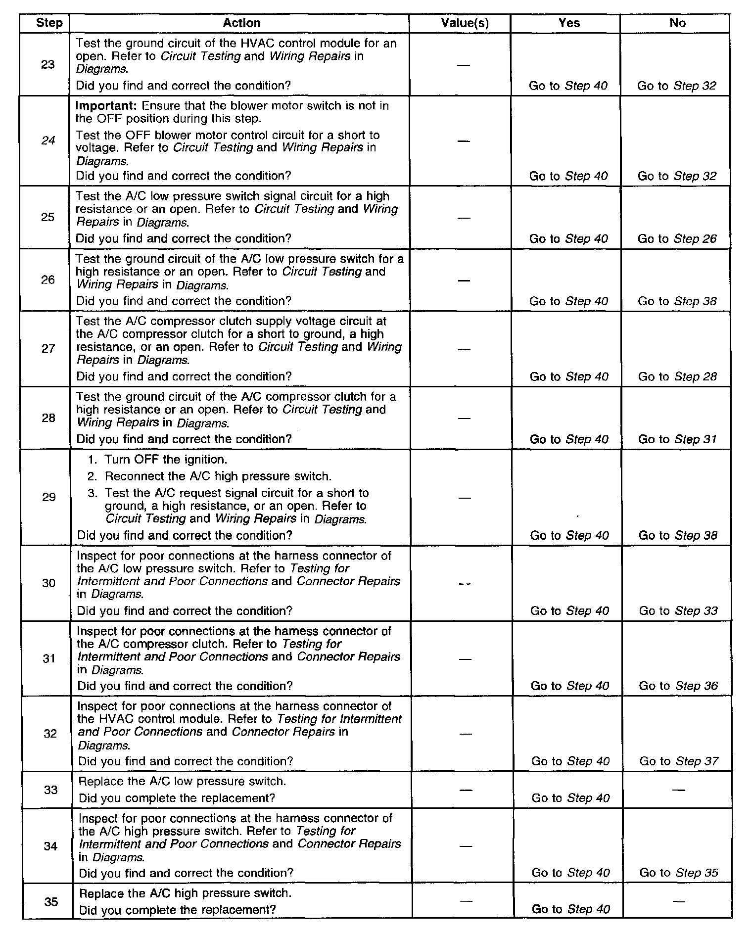 24. When the blower motor is in the OFF position, a voltage is applied to the OFF blower motor control circuit. The A/C system will not operate if a voltage is applied to the OFF blower motor control circuit.