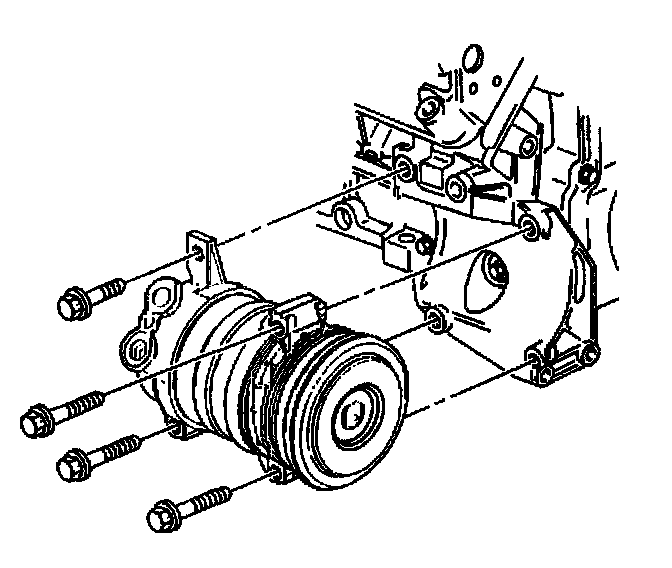 2. Install the A/C compressor to the bracket through the fender well. Insert the mounting bolt into the lower right mounting boss before installing the A/C compressor.