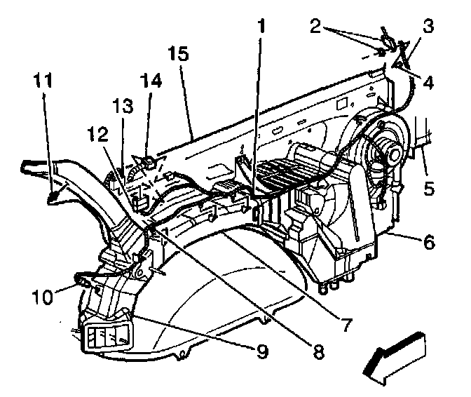 1. Install the rear upper A/C temperature sensor (11) to the air distribution duct.