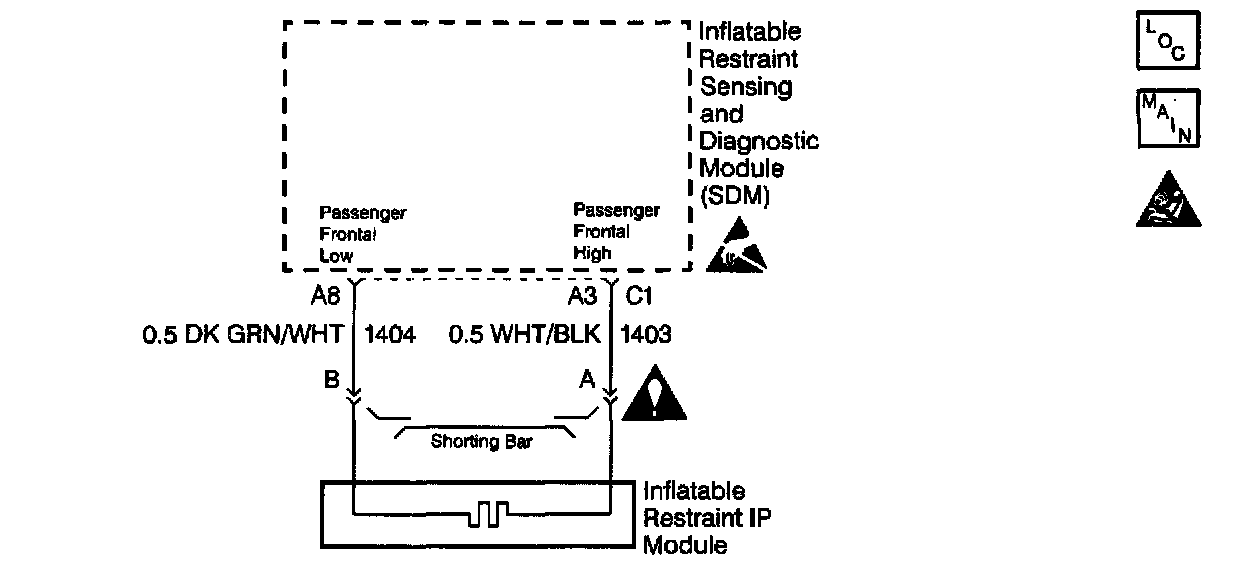 ^ The SDM detects the voltage at the passenger frontal high is less than 2.4 Volts and passenger frontal high to low side resistance is 6 Ohms or greater for 300 milliseconds.