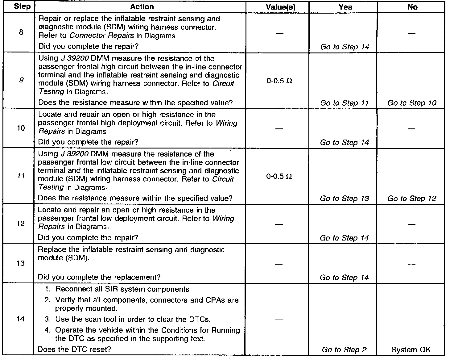 11. Tests for an open or high resistance in the passenger frontal low deployment circuit or if there is a malfunctioning SDM.