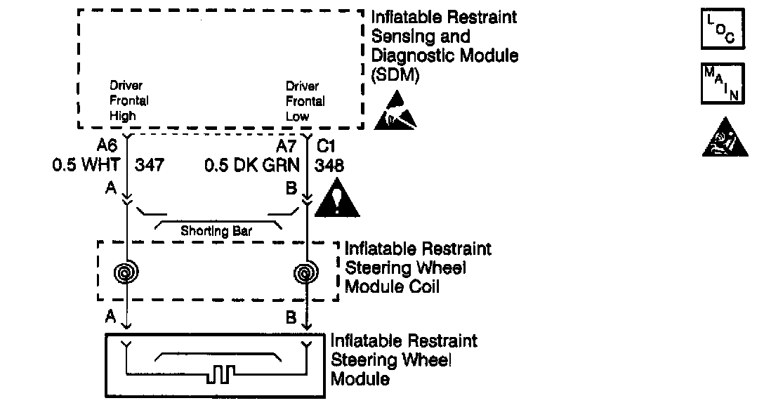 When you first turn the ignition switch to the RUN position, the inflatable restraint Sensing and Diagnostic Module (SDM) performs tests to diagnose critical malfunctions within itself. The SDM then performs the following continuous diagnostic tests on the deployment loops: