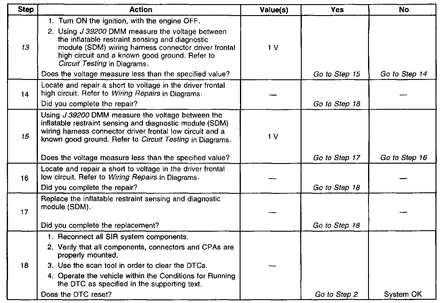 15. Tests for a short to voltage in the driver frontal low deployment circuit or if there is a malfunctioning SDM.