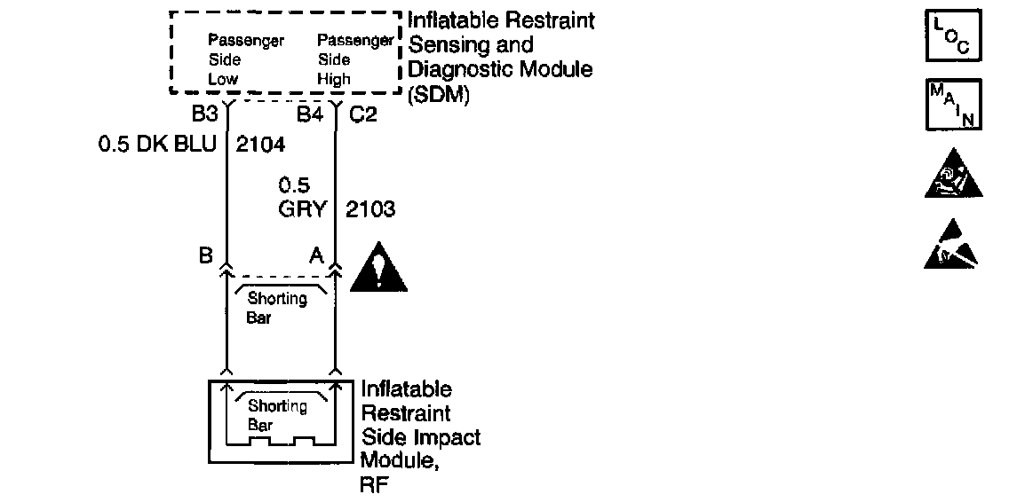 ^ The SDM detects the voltage at passenger side high is less than 2.4 Volts and passenger side high to low side resistance is less than 6 Ohmsfor 500 milliseconds.