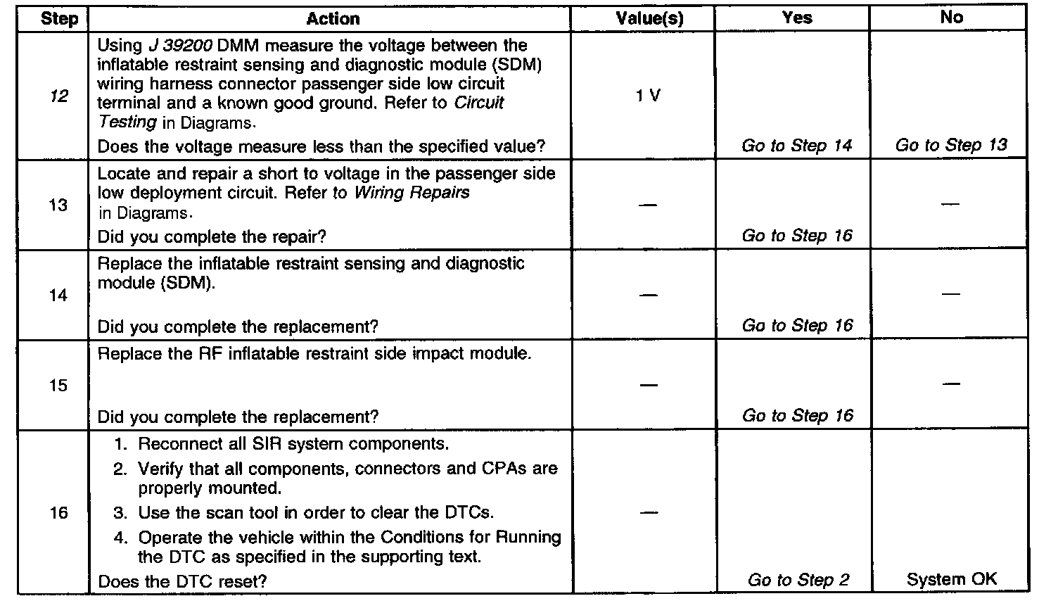 12. Tests for a short to voltage in the passenger side low deployment circuit or if there is a malfunctioning SDM.