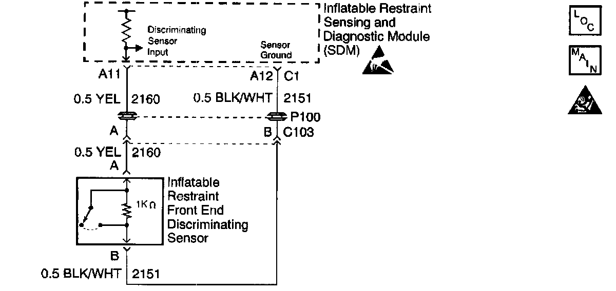 The inflatable restraint Sensing and Diagnostic Module (SDM) monitors the front end discriminating sensor circuit for front impact detection. The SDM processes the signal provided by the front end discriminating sensor to further support deployment of the air bags. The front end discriminating sensor is an input only to the SDM and does not directly cause air bag deployment. When you first turn the ignition switch to the RUN position, the inflatable restraint sensing and diagnostic module (SDM) performs tests to diagnose critical malfunctions within itself. The SDM then performs the following continuous diagnostic tests on the deployment loops: