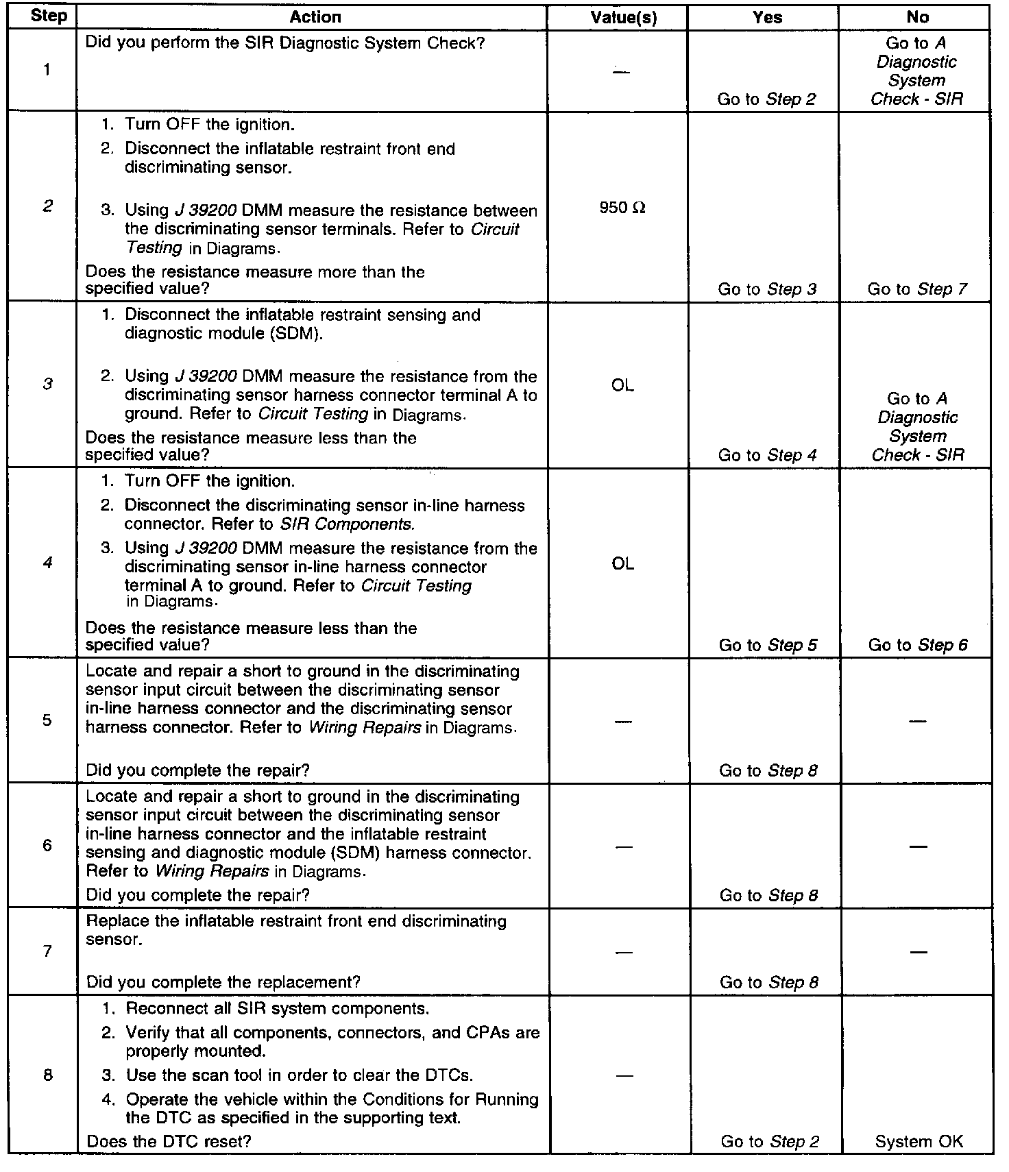 A broken or chafed wire in the inflatable restraint front end discriminating sensor circuit may cause an intermittent condition to occur. Refer to Testing for Intermittent and Poor Connections in Diagrams.