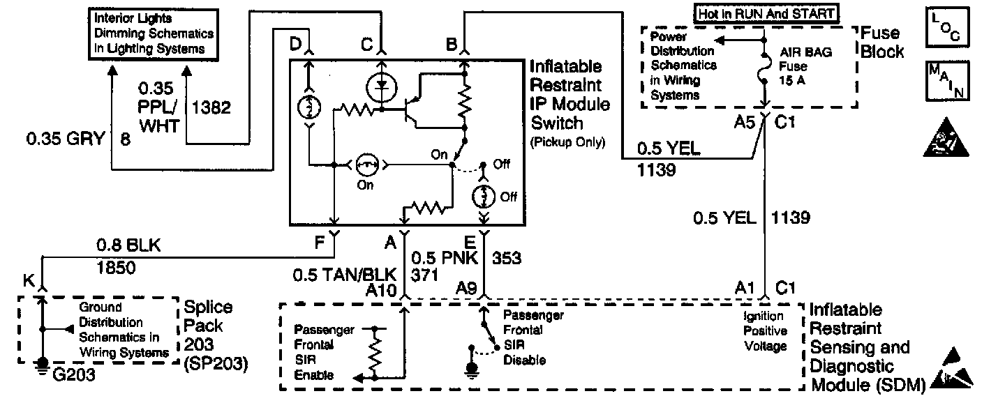 When you first turn the ignition switch to the RUN position, the inflatable restraint Sensing and Diagnostic Module (SDM) performs tests to diagnose critical malfunctions within itself. The SDM monitors the voltage levels at the passenger frontal SIR enable and disable terminals of the SDM to determine the position of the inflatable restraint IP module switch. The SDM then performs the following continuous diagnostic tests on the deployment loops: