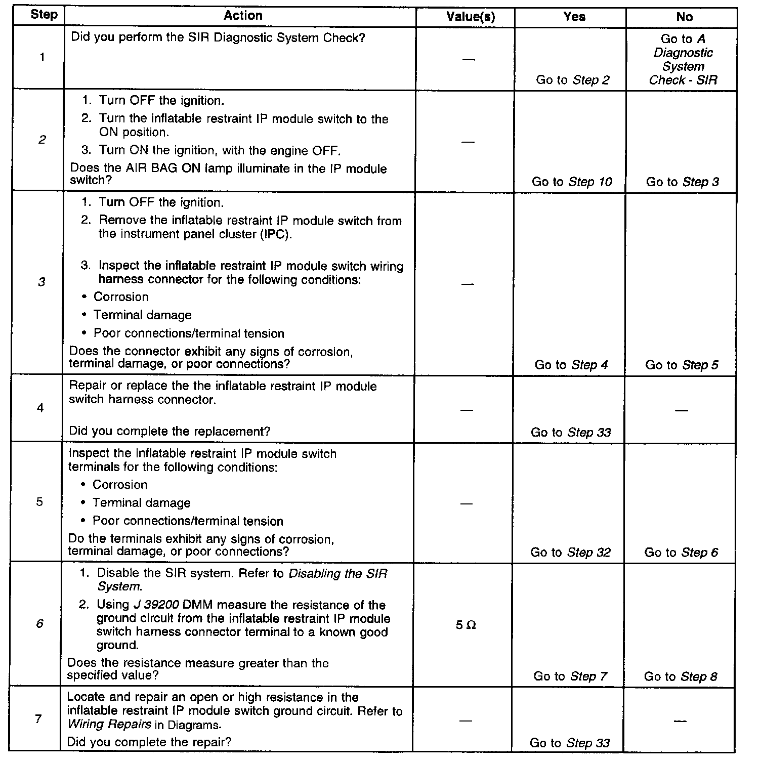 ^ The voltage detected at passenger frontal SIR enable terminal and passenger frontal SIR disable terminal are greater than 4.0 Volts when the AIR BAG ON lamp is commanded OFF.