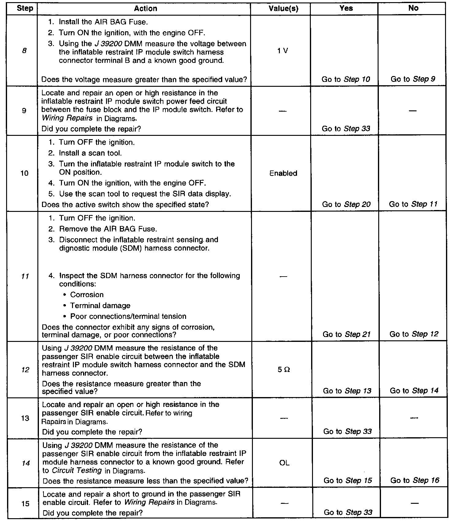 12. Tests for an open or high resistance in the passenger SIR enable circuit.