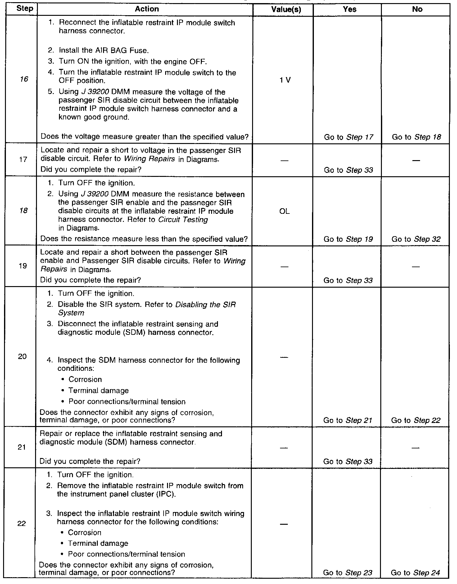 18. Tests for a short between the passenger SIR enable and disable circuits.