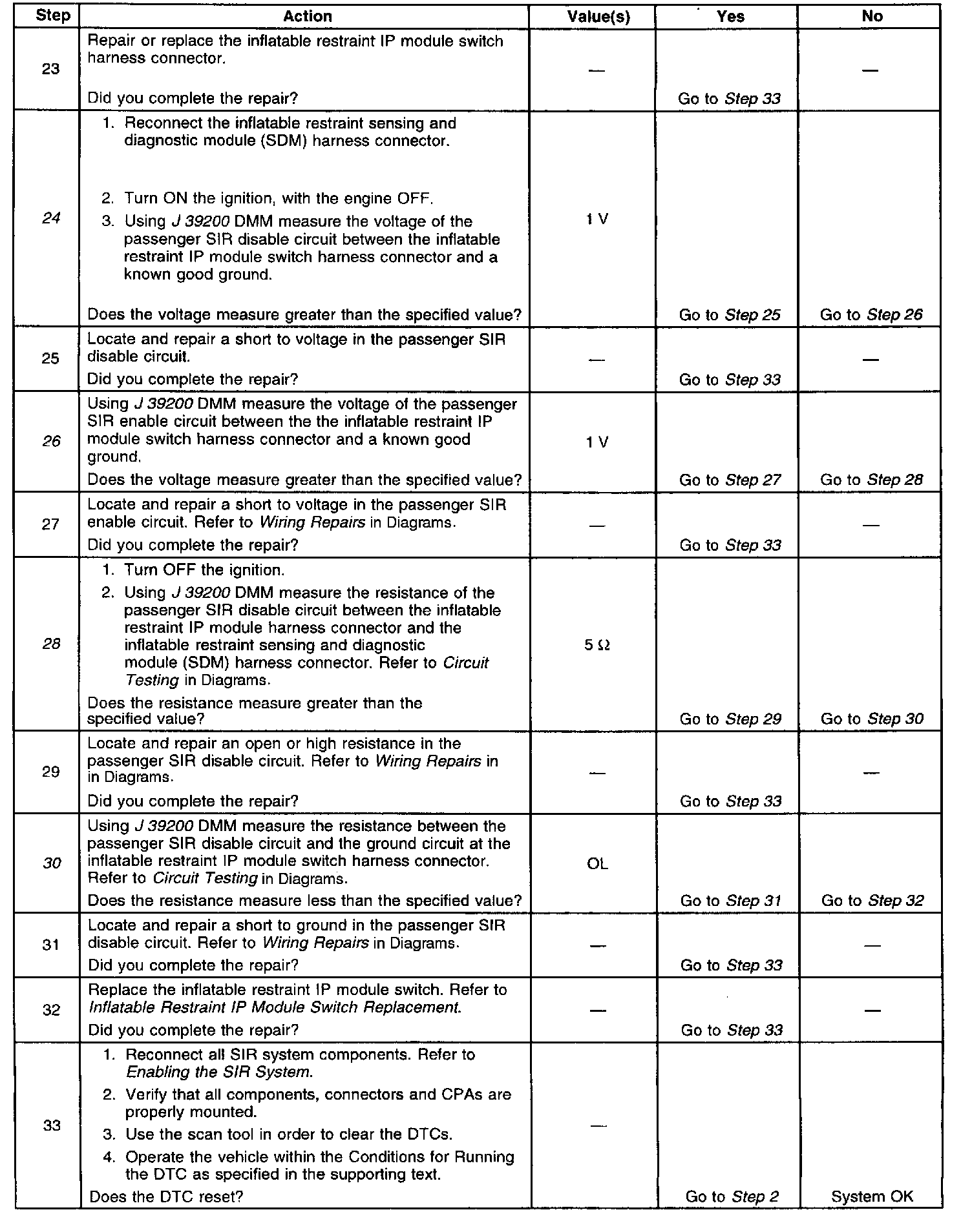 28. Tests for an open or high resistance in the passenger SIR disable circuit.
