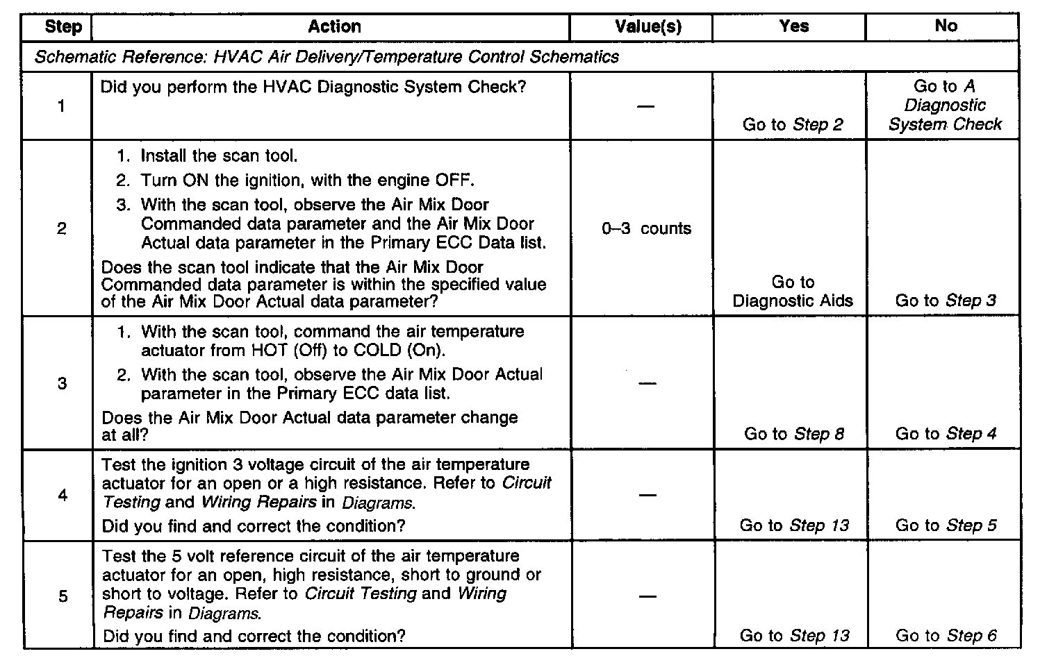 The air temperature actuator is an electronic device that incorporates a stepper motor and feedback potentiometer. The HVAC control module determines the position of the air temperature actuator based on the voltage from the potentiometer. When a change in air temperature is required (greater than 4 counts) the HVAC control module will drive the air temperature actuator in the appropriate direction to achieve the desired setting while comparing the actual position to the commanded position. If the actual value differs from the commanded value by 4 or more counts, the actuator is considered stalled and the DTC will set.