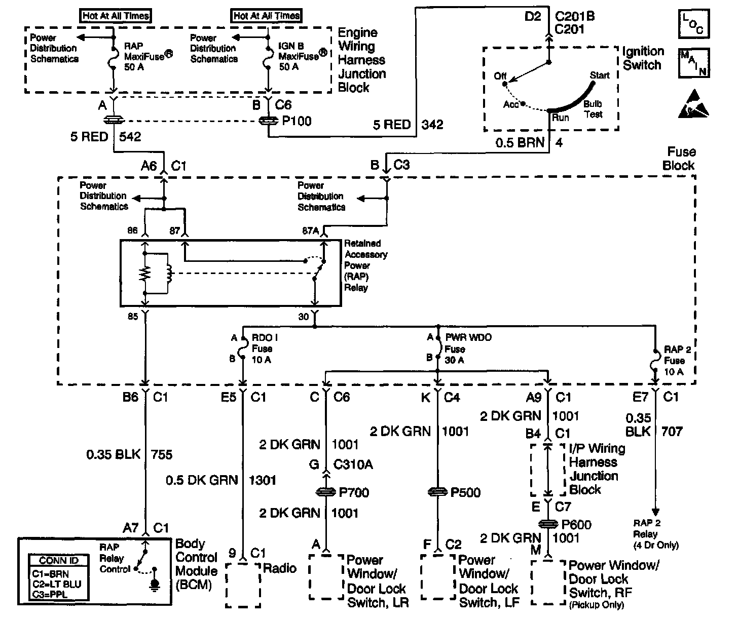 The retained accessory power (RAP) function allows certain Systems such as the radio, the power windows and the sunroof (if equipped) to operate 20 minutes after the ignition switch is turned OFF. The body control module (BCM) monitors the ignition switch position, the mini wedge (door jamb) switches and the voltage on the RAP relay control circuit. The BCM will command the RAP relay ON by grounding the RAP relay control circuit.