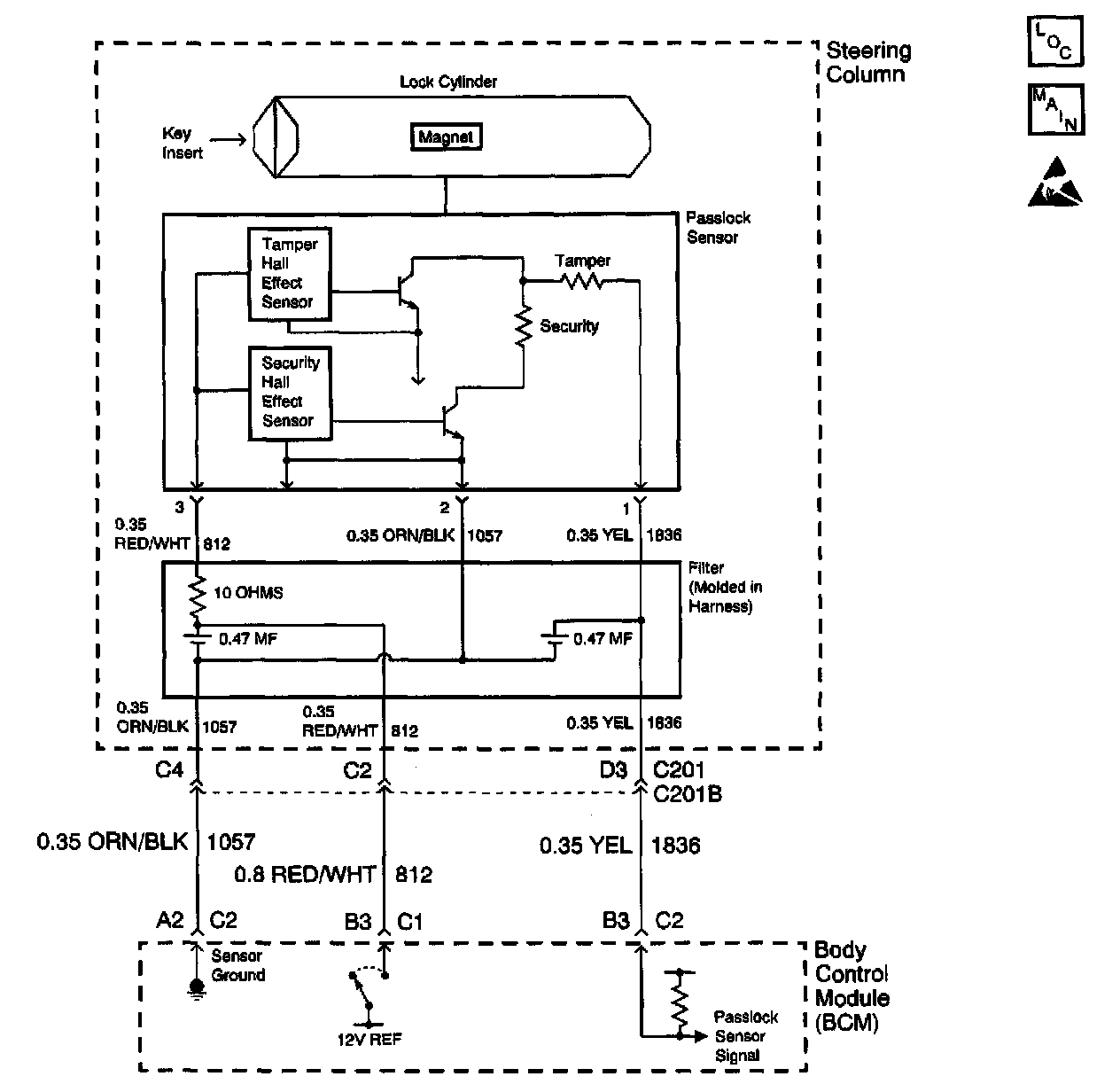 When the Passlock(TM) sensor is powered and the ignition switch is rotated to the CRANK position, the hall effect security sensor will latch and provide a code to the BCM. The BCM will then compare this code to the code in the previous ignition cycle. If the latched value is the same as the last ignition cycle value, the test has passed. When the ignition switch is switched to the OFF position, the sensor is no longer powered and resets the sensor latch circuit.
