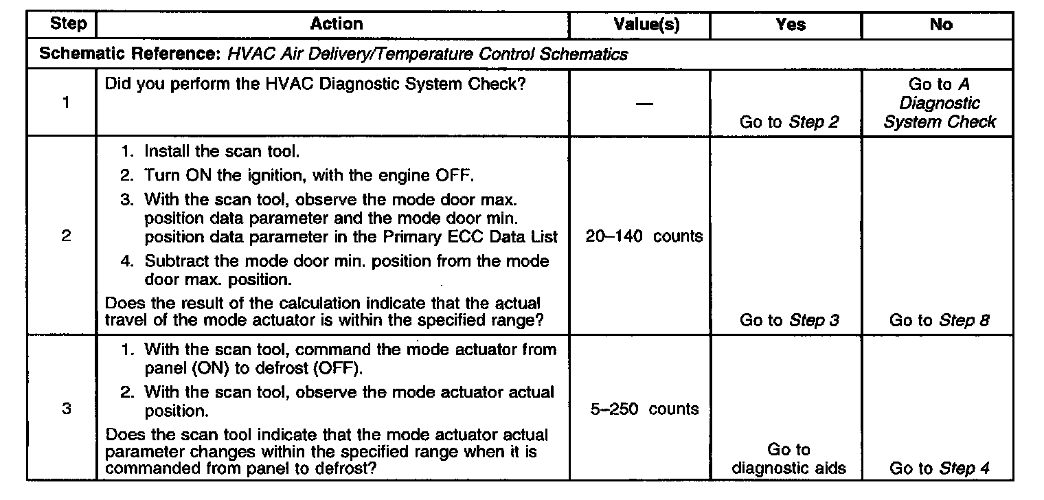 After a calibration or recalibration procedure is performed, the HVAC control module calculates the mode actuator travel range. The HVAC control module commands the actuator through it's full range. The HVAC control module stores the learned minimum and maximum position values. The travel range value is calculated by subtracting the minimum and maximum position values. Then the HVAC control module compares the travel range, minimum and maximum values to calibrated value ranges. If the travel range value is less than or equal to the maximum calibrated limit and greater than or equal to the minimum calibrated limit, then the calibration is considered successful. The HVAC control module continuously compares the actual actuator position to the calibrated minimum and maximum position values.